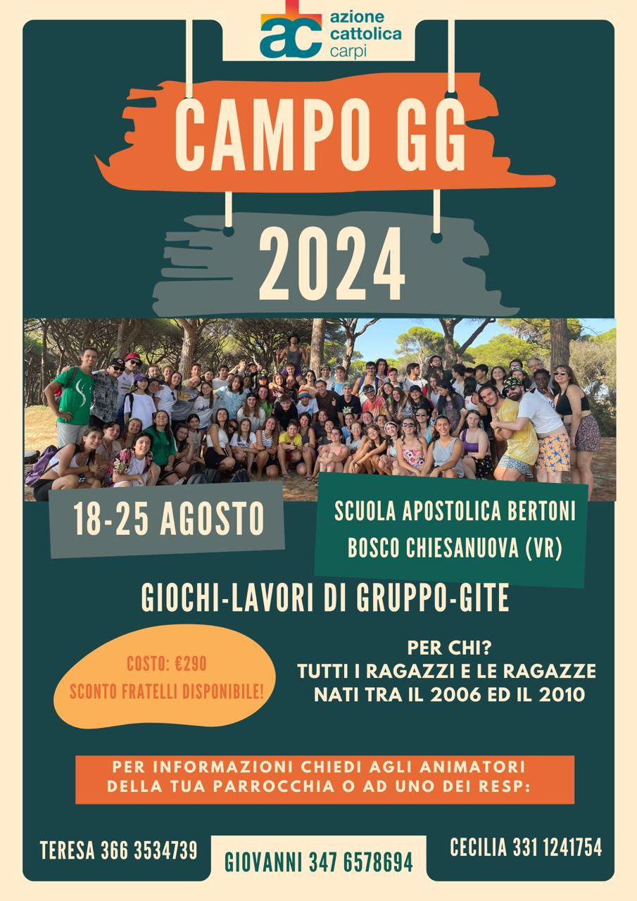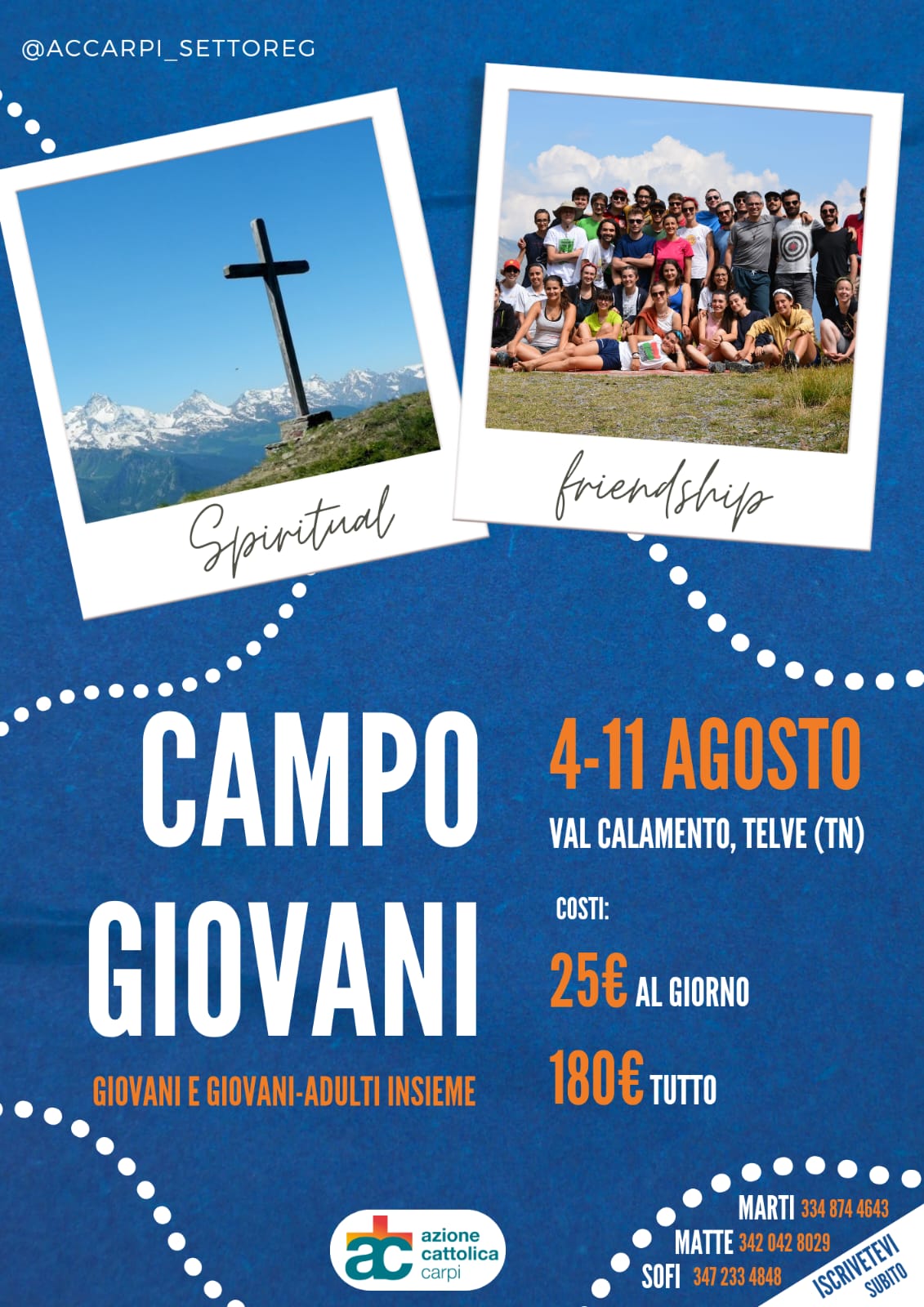 Siamo sempre più vicini agli attesissimi campi Giovani e Giovanissimi! Il campo G e GA avrà luogo a Telve, in Val Calamento in provincia di Trento, in una casa per gruppi presa in prestito della parrocchia di Moglia, dal 3 all’11 agosto; invece il campo Giovanissimi si terrà a Villa Stimmatini, a Bosco Chiesanuova, dal 18 al 25 agosto.