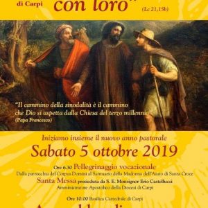 Un cammino indicato da papa Francesco nella sinodalità: “Il cammino della sinodalità è il cammino che Dio si aspetta dalla Chiesa del terzo millennio” (17 ottobre 2015). Fare “sinodo” significa “camminare insieme”. Tenendo sullo sfondo il documento programmatico di papa Francesco, l’esortazione Evangelii Gaudium (24.11.2013), propongo tre aspetti della sinodalità per l’anno pastorale 2019-2020 sui quali invito a riflettere le comunità cristiane della diocesi di Carpi, parrocchie, gruppi, associazioni: la vocazione alla santità (1. Gesù cammina con noi chiamandoci alla santità “della porta accanto”), la comunione ecclesiale (2. I discepoli camminano con Gesù diventando “Chiesa”) e la testimonianza nella società (3. I discepoli camminano verso Gerusalemme per testimoniare il Risorto).