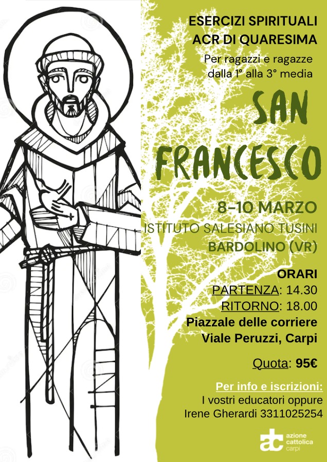 Esercizi Spirituali ACR medie Quaresima 2024By Redazione Posted 8 Marzo 2024 In Eventi, Eventi ACREsercizi Spirituali ACR medie Quaresima 20242024-03-082024-02-07https://www.accarpi.it/wp-content/uploads/2017/10/accarpi-logo.pngAzione Cattolica Diocesi di Carpihttps://www.accarpi.it/wp-content/uploads/2017/10/accarpi-logo.png200px200px 0 Data / Ora ven 08 Mar 2024 - dom 10 Mar 2024 Luogo Istituto Salesiano Sacro Cuore CategorieEventiEventi ACR