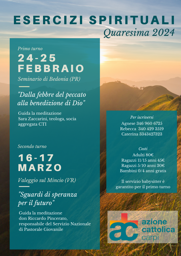 Esercizi Spirituali Unitari Quaresima 2024By Redazione Posted 24 Febbraio 2024 In Eventi, Eventi Adulti, Eventi GEsercizi Spirituali Unitari Quaresima 20242024-02-242024-02-07https://www.accarpi.it/wp-content/uploads/2017/10/accarpi-logo.pngAzione Cattolica Diocesi di Carpihttps://www.accarpi.it/wp-content/uploads/2017/10/accarpi-logo.png200px200px 0 Data / Ora sab 24 Feb 2024 - dom 25 Feb 2024 Luogo Seminario di Bedonia (PR) CategorieEventiEventi AdultiEventi G