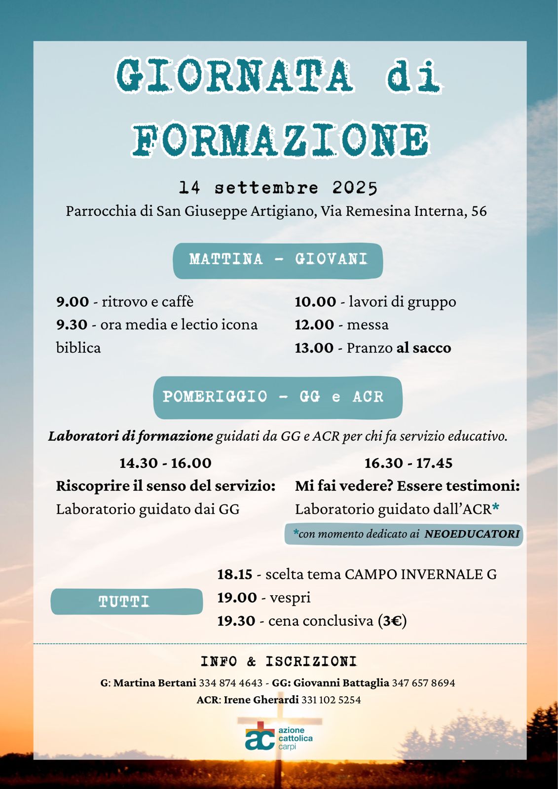 Giornata di formazione diocesanaBy Redazione Posted 14 Settembre 2025 In Eventi, Eventi ACR, Eventi Adulti, Eventi G, Eventi GGGiornata di formazione diocesana2025-09-142025-09-07https://www.accarpi.it/wp-content/uploads/2017/10/accarpi-logo.pngAzione Cattolica Diocesi di Carpihttps://www.accarpi.it/wp-content/uploads/2017/10/accarpi-logo.png200px200px 0 Data / Ora dom 14 Set 2025 CategorieEventiEventi ACREventi AdultiEventi GEventi GG