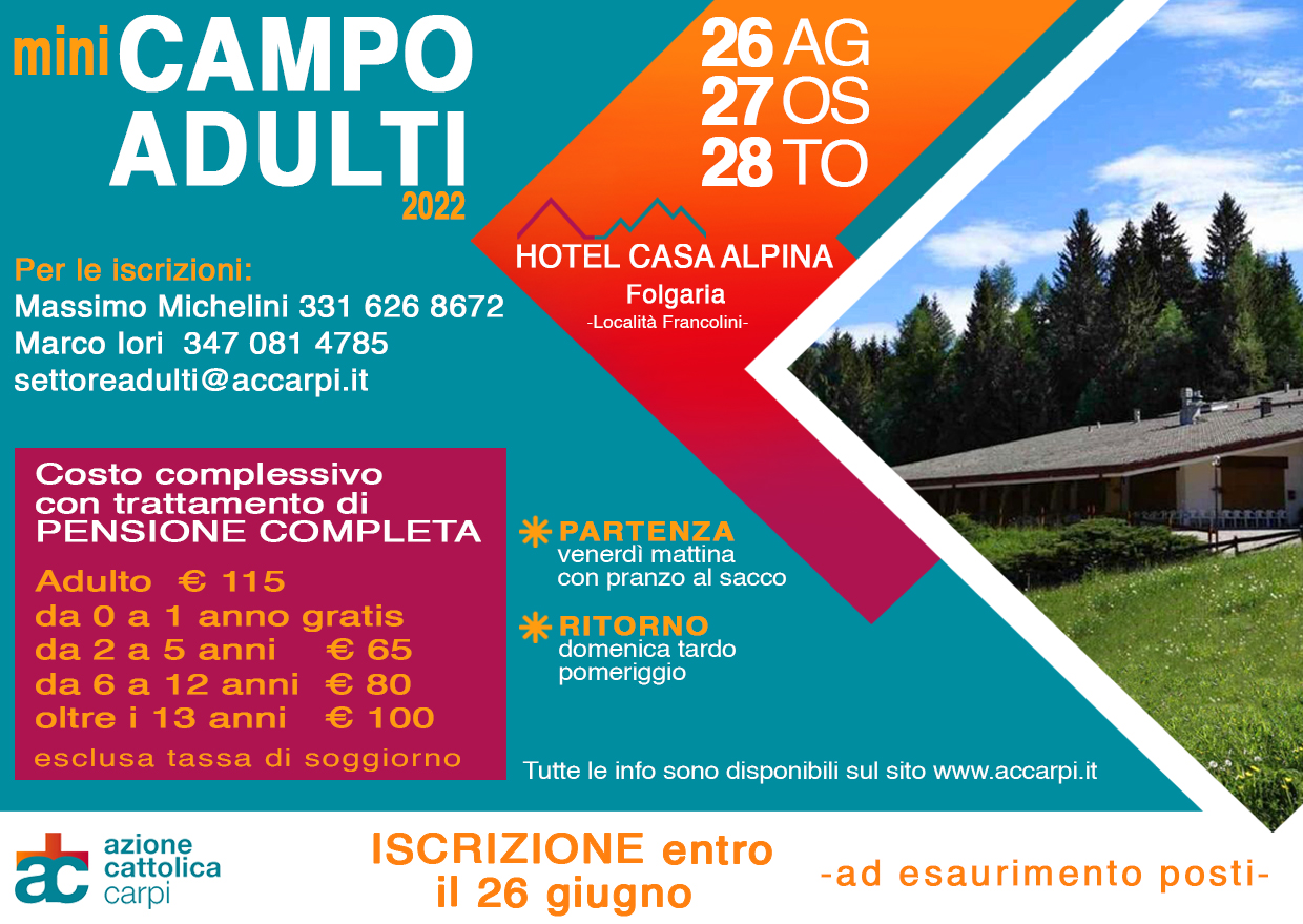 Il campo estivo adulti 2022 si terrà nel weekend 26-28 agosto presso l’Hotel Casa Alpina a Folgaria.