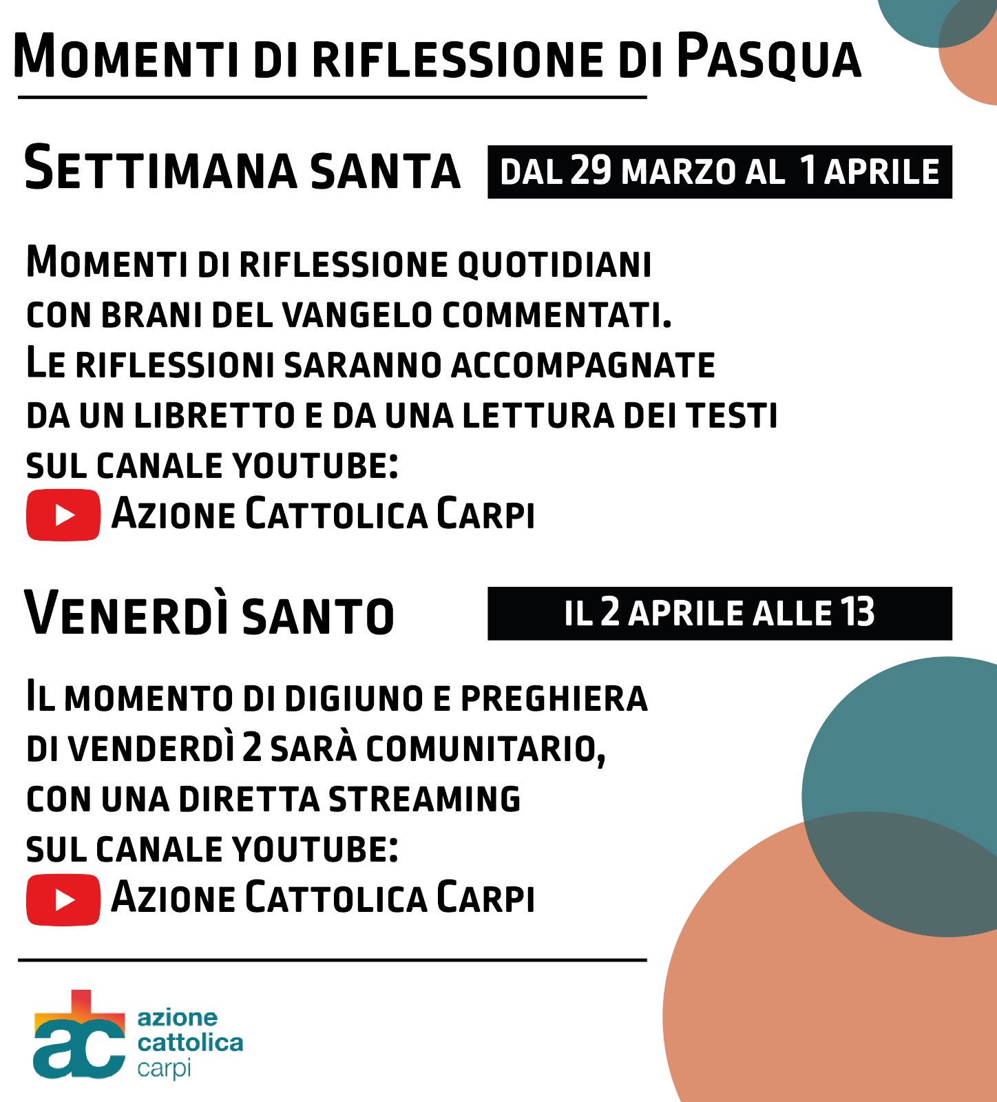 Dal lunedì al giovedì della Settimana Santa, sarà disponibile un commento del Vangelo del giorno a cura di noi Giovani sul canale YouTube dell’Azione Cattolica di Carpi, questo percorso terminerà Venerdì con il momento di digiuno e preghiera. Quest’anno per le riflessioni saremo aiutati dalla Fratelli Tutti di Papa Francesco.