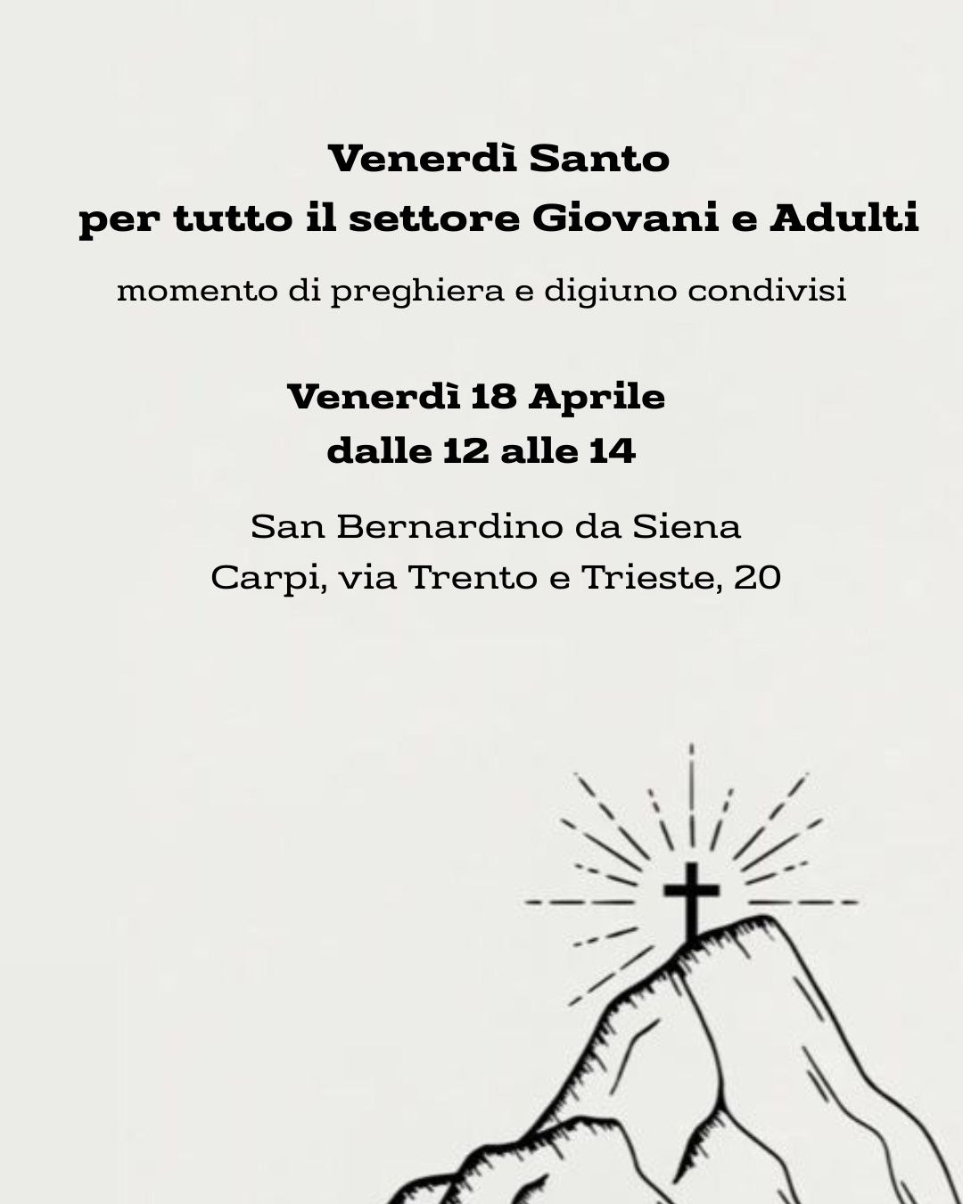 Veglia di preghiera del venerdì SantoBy Redazione Posted 18 Aprile 2025 In Eventi, Eventi Adulti, Eventi G, Eventi GGVeglia di preghiera del venerdì Santo2025-04-182025-04-15https://www.accarpi.it/wp-content/uploads/2017/10/accarpi-logo.pngAzione Cattolica Diocesi di Carpihttps://www.accarpi.it/wp-content/uploads/2017/10/accarpi-logo.png200px200px 0 Data / Ora ven 18 Apr 2025 Luogo San Bernardino da Siena CategorieEventiEventi AdultiEventi GEventi GG