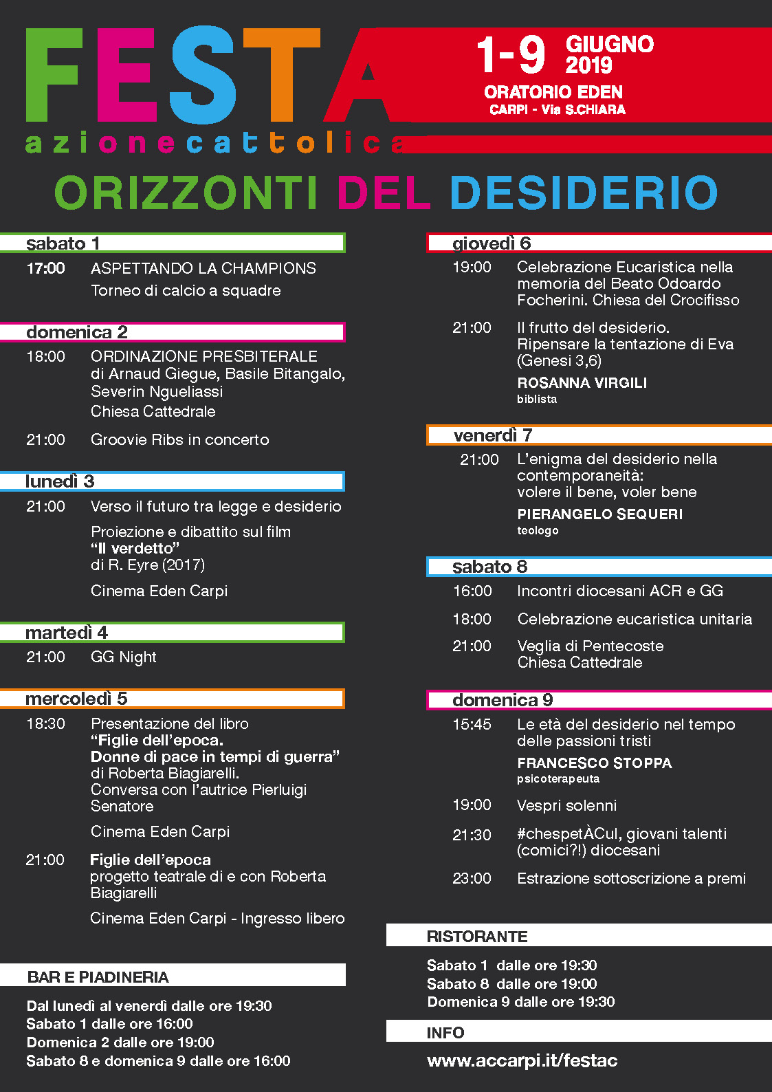 Un programma ricco di eventi, conferenze e grandi ospiti è quello proposto dall’Azione Cattolica che conclude sempre il proprio anno associativo con una festa, che si terrà a Carpi da sabato 1° giugno a domenica 9 presso l’Oratorio cittadino dell’Eden.