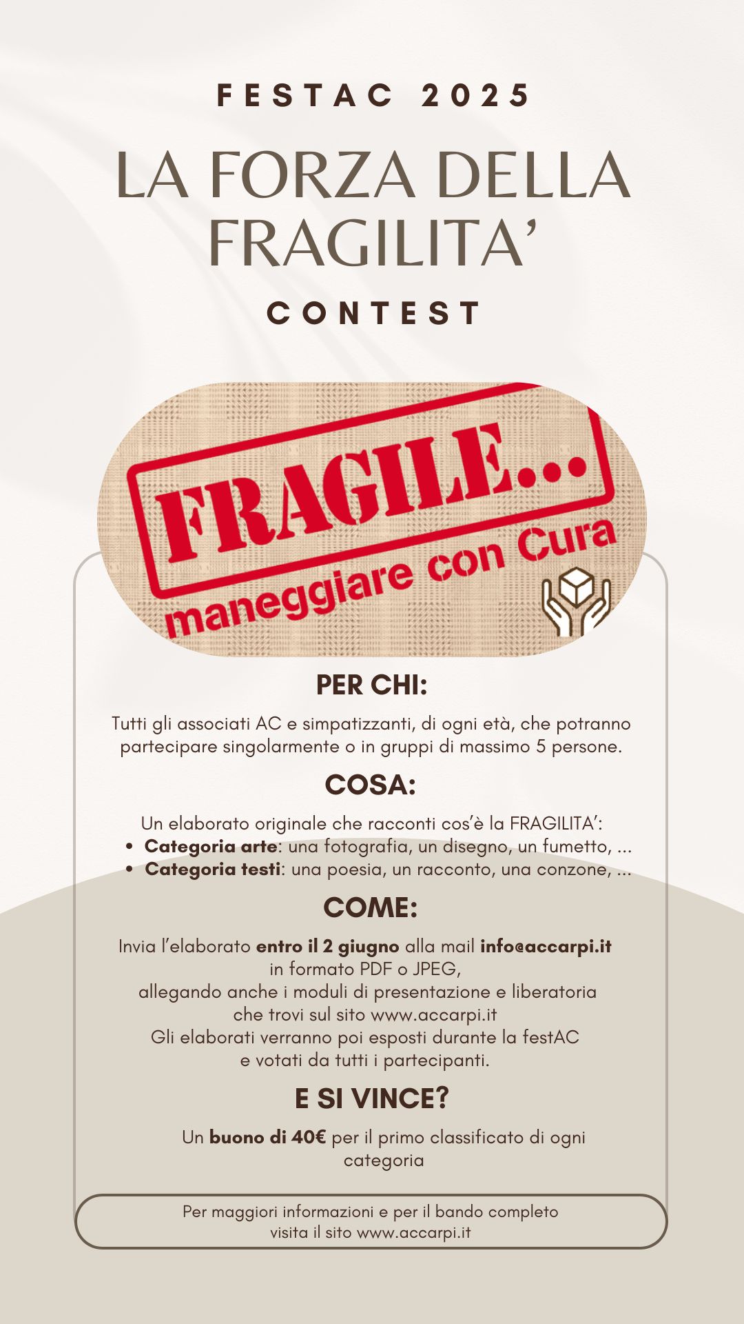 L’obiettivo principale è quello di promuovere una nuova sensibilità verso l’altro, favorendo il dialogo tra generazioni e stimolando la creatività dei giovani. Ogni partecipante avrà l’opportunità di esprimere la propria visione della fragilità attraverso opere artistiche o testi, con la possibilità di partecipare singolarmente o in gruppi di massimo cinque persone.