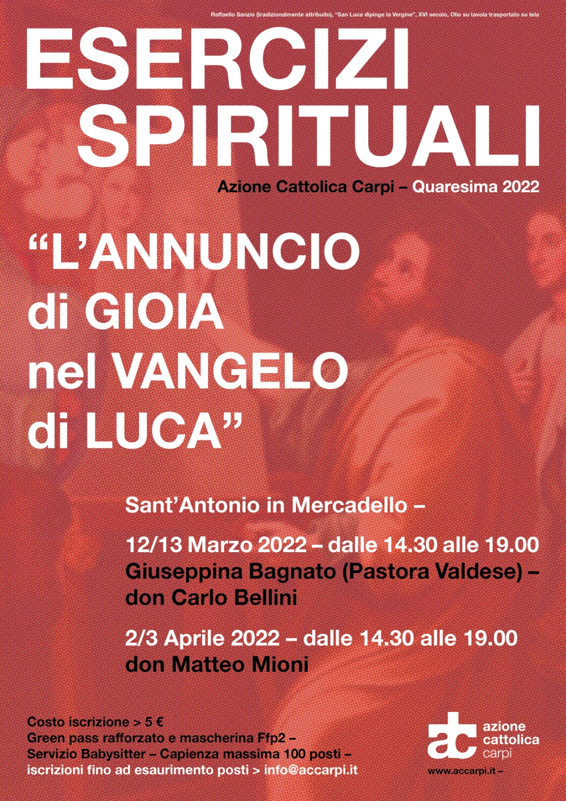 Il tema delle meditazioni sarà “L’annuncio di gioia nel Vangelo di Luca” e saranno condotte da Giuseppina Bagnato, pastora della Chiesa Evangelica Valdese di Bologna, e don Carlo Bellini, assistente generale di AC di Carpi, per il primo turno, mentre il secondo turno sarà guidato da don Matteo Mioni, sacerdote diocesano della Chiesa di Reggio Emilia-Guastalla, consacrato nei Fratelli della Carità all’interno della Congregazione Mariana delle Case di Carità e Cappellano della Casa Circondariale di Reggio Emilia.
