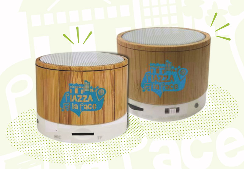 Il gadget scelto quest’anno, per contribuire al sostegno dei due progetti e “piazzare la pace” nei territori in cui si attualizzano e, unitamente, nell’ordinario delle nostre vite e del nostro impegno, è una piccola cassa di amplificazione bluetooth, funzionante grazie al collegamento con un dispositivo mobile.